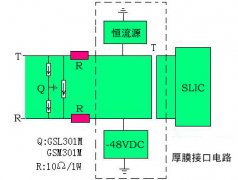 ◇常见的SLIC保护电路中,均采用PTC作第一级过流保护,然后并联ST的3端半导体防雷管作过压保护。该保护方案不仅成本极高(10元以上),而且实际保护效果不佳。在10/700us电压波形下2KV冲击时,PTC已被击穿断路。 我公司实际经验推荐的防护方案如上图,BENCENT专利产品GSL301M(插件)GSM301M(贴片)并接在接口电路最前端,电阻和PTC串接在电路中用于限流。该方案价格低廉(约6元),而且10/700us波形下雷击测试4KV,设备无损害。--达到ITU-TK20/K21的最高雷击标准。