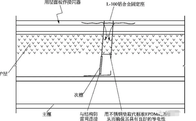 屋面板满足上述所有条件时,可以将屋面板作为接闪器,从而大大使整个屋面更加整洁美观。用屋面板作为接闪器的节点图,如图11-2所示;屋面防雷大样图,如图11-3所示。